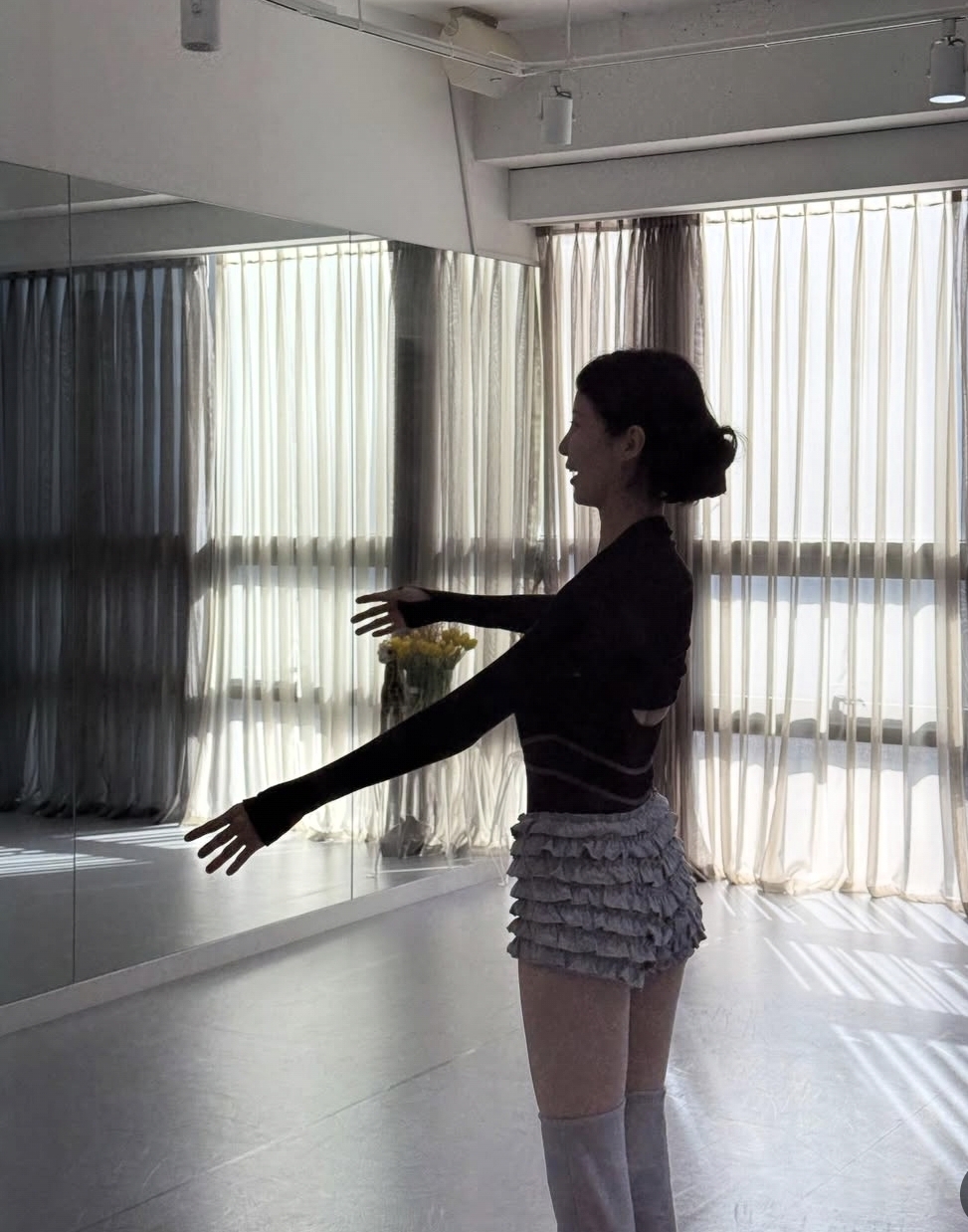 이번에 공개된 사진들은 두 사람이 함께 발레와 스트레칭을 하는 모습을 담고 있어요. 햇살이 따뜻하게 들어오는 넓은 연습실, 거울에 비친 두 사람의 모습은 그 자체로 한 폭의 그림 같았죠.