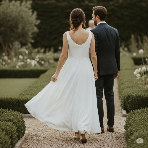 - 짧은 기장 또는 비대칭 디자인: 바닥에 끌리는 긴 기장의 드레스 대신, 발목까지 오는 미디 기장이나 무릎 위까지 오는 짧은 기장의 드레스도 인기를 얻고 있습니다. 앞은 짧고 뒤는 긴 '언밸런스(하이-로우)' 디자인이나, 트임 디테일이 들어간 드레스도 주목받고 있습니다. 이러한 스타일은 야외 결혼식, 스몰 웨딩, 하우스 웨딩 등 자유롭고 캐주얼한 분위기의 결혼식에 특히 잘 어울립니다. 활동성도 뛰어나서 야외 촬영 시에도 편리합니다.
