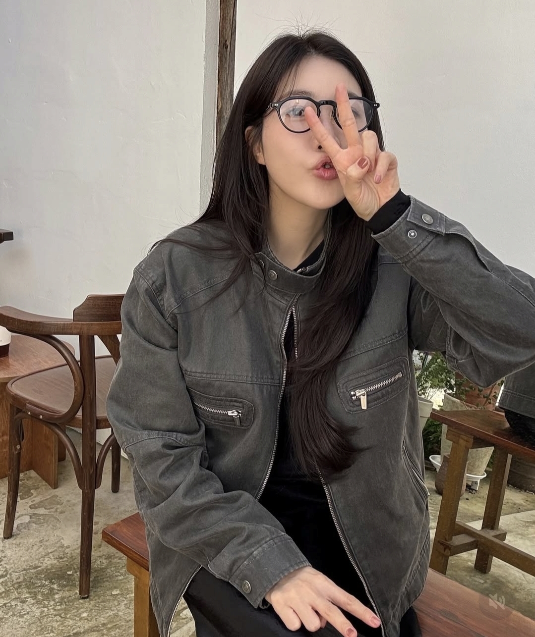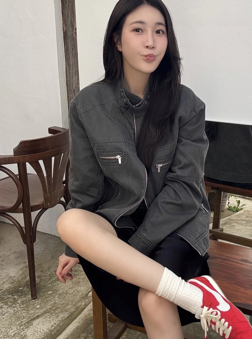 사진 속 이해리 씨는 빈티지한 느낌이 물씬 나는 '차콜 그레이' 컬러의 집업 자켓을 입고 있는데요.