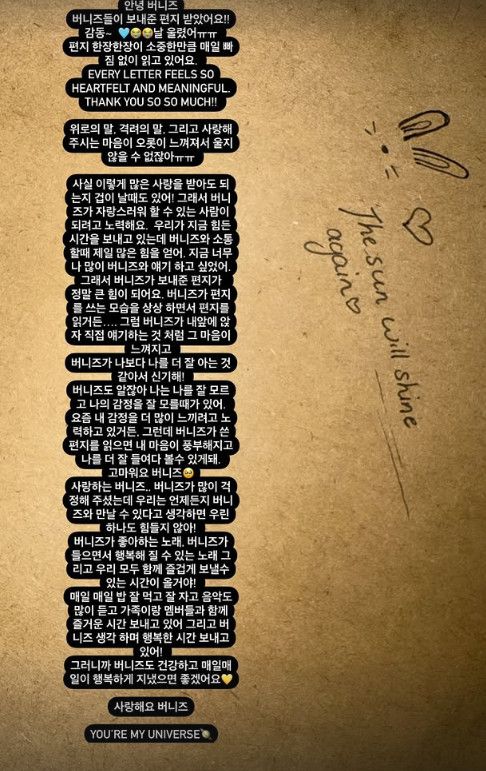 이같은 메시지는 뉴진스가 팬들과의 소통에 얼마나 큰 가치를 두고 있는지를 드러내며, 팬들이 보내는 작은 정성이 멤버들에게 큰 힘이 된다는 사실을 보여줍니다. 팬들에게 받은 편지를 매일 빠짐없이 읽으며 그 감동을 다시 새긴다는 내용은, 그룹이 팬들과의 관계를 얼마나 소중히 여기고 있는지를 잘 나타냅니다.