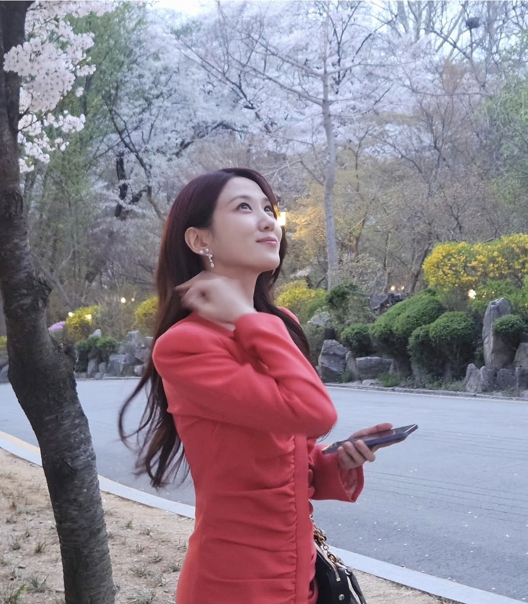 사실 벚꽃 사진은 누구나 찍을 수 있습니다. 하지만 같은 장소, 같은 계절이라도 분위기가 완전히 달라지는 건 결국 사람과 스타일 때문입니다. 이번 사진에서는 밝은 레드 컬러 원피스가 전체 분위기를 확 살려주고 있습니다.