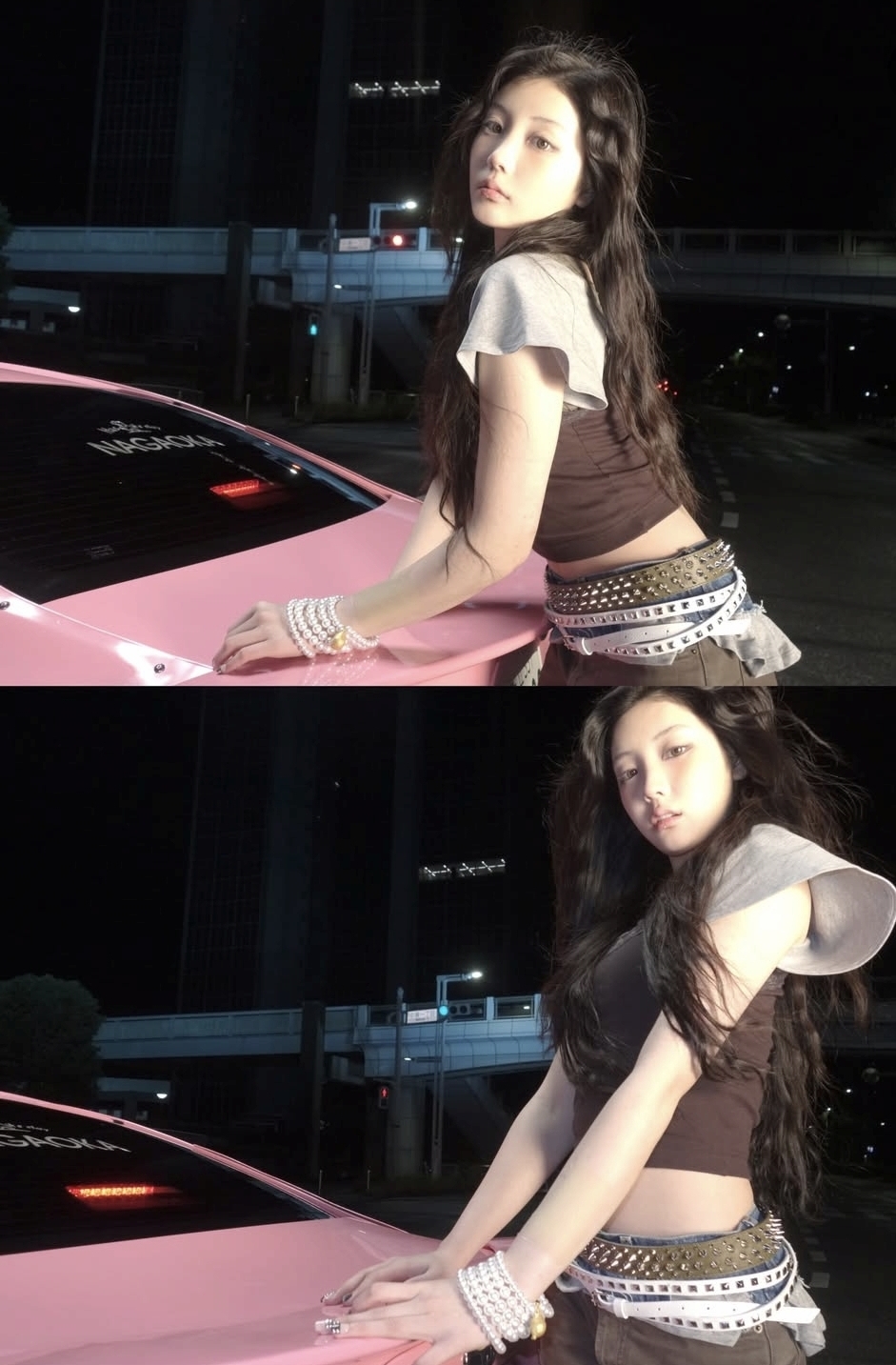 사진 한번 보세요. 진짜 감탄만 나오지 않나요? 어두운 밤거리를 배경으로 쨍한 핑크색 자동차 뒤에 서 있는데, 이게 무슨 하이틴 영화 스틸컷인 줄 알았습니다. 평소의 그 순둥순둥한 느낌은 온데간데없고, 완전 힙하고 시크한 매력이 철철 넘치네요.