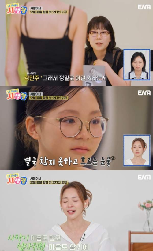 하지만 처음으로 마주한 낯선 오디션장 분위기에 사랑이는 결국 "무섭다"고 말하며 긴장한 모습을 감추지 못했습니다. 저도 그 모습을 보면서 얼마나 떨렸을까 싶어 마음이 짠했습니다. 다행히 모델 학원에서 함께 연습했던 언니들을 현장에서 만나 응원을 받고, 같이 연습도 하면서 조금씩 긴장을 푸는 모습을 보여 안도했습니다.