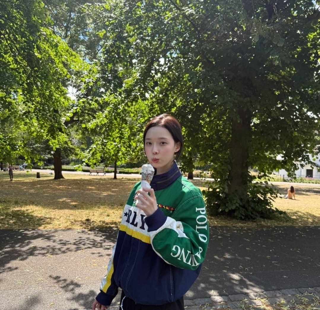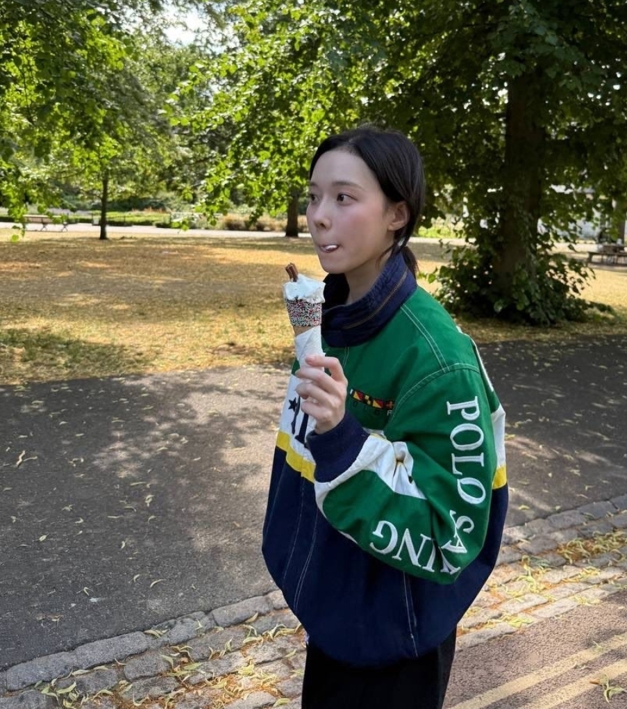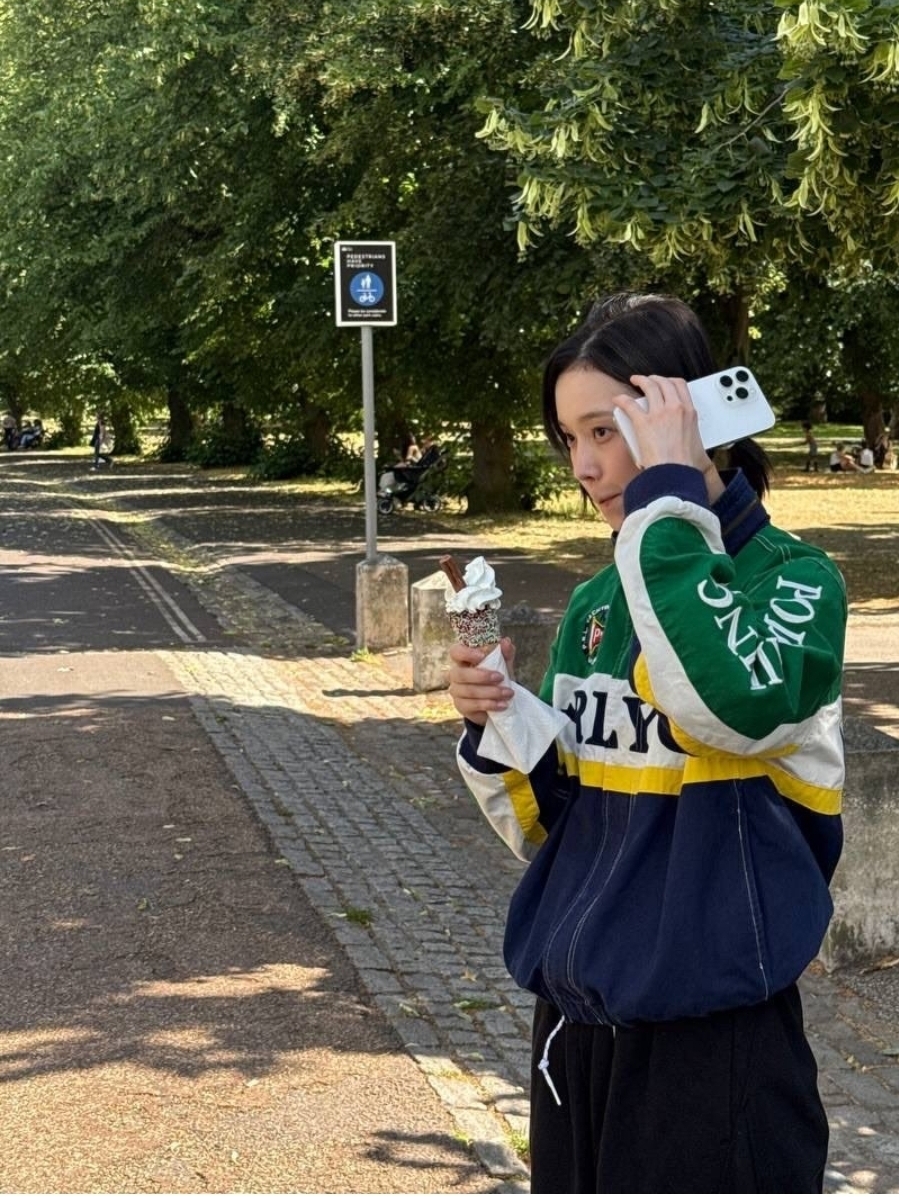 그리고 이번 사진들의 하이라이트는 뭐니 뭐니 해도 먹방 요정 윈터의 모습들이 아닐까 싶어요. 런던 그리니치 공원(Greenwich Park)으로 보이는 푸르른 나무들을 배경으로 아이스크림을 먹고 있는 사진은 정말이지 힐링 그 자체입니다. 영국에서 유명한 초콜릿 막대가 꽂힌 소프트 아이스크림을 손에 들고 있는데, 아이스크림에 집중한 저 진지한 표정이 너무 귀엽지 않나요?