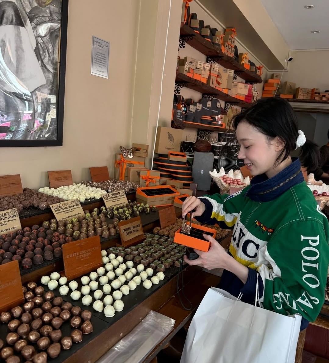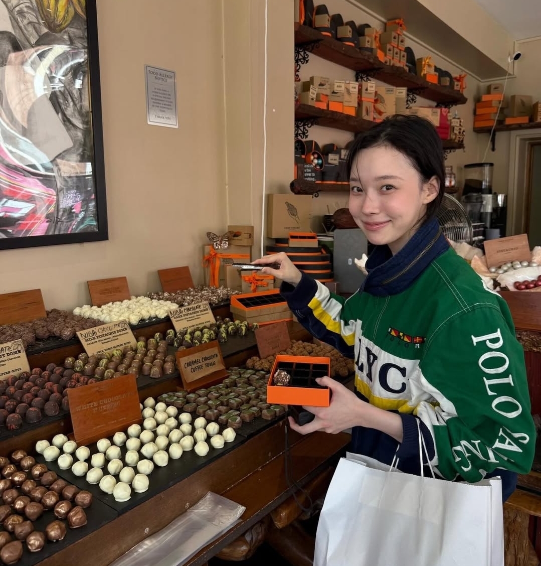 초콜릿 가게에서의 모습도 빼놓을 수 없죠. 다양한 초콜릿이 진열된 쇼케이스 앞에서 눈을 반짝이며 행복해하는 윈터의 미소는 정말 백만 불짜리예요. 한 손에는 초콜릿 상자를 들고, 다른 한 손으로는 시식을 하려는 건지 아니면 초콜릿을 가리키는 건지 신나 보이는 저 제스처! 우리도 여행 가서 맛있는 디저트 가게 들어가면 딱 저런 표정 짓잖아요? "이거 다 먹고 싶다" 하는 그 행복한 고민의 순간이 사진 밖으로까지 전해지는 것 같아요.