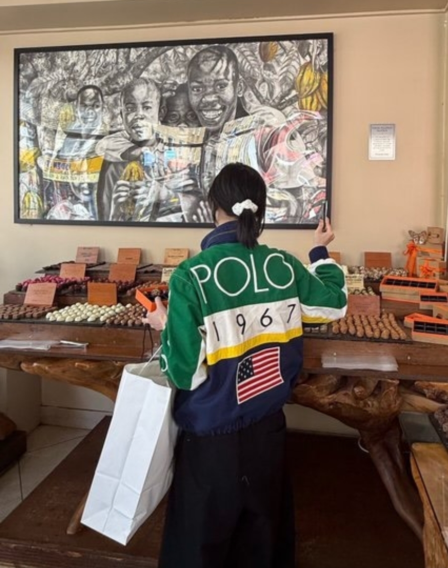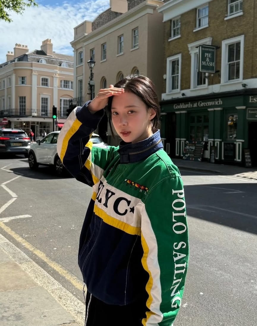 윈터가 착용한 저 초록색 자켓, 너무 예쁘지 않나요? 폴로 랄프 로렌의 빈티지 라인으로 보이는 세일링 자켓인데, 그린과 네이비, 그리고 옐로우 컬러가 큼직하게 배색된 디자인이 레트로하면서도 힙한 느낌을 제대로 살려주고 있어요. 자켓 전면에 큼지막하게 박힌 로고와 국기 자수 디테일들이 자칫 심심할 수 있는 룩에 확실한 포인트가 되어주네요.
