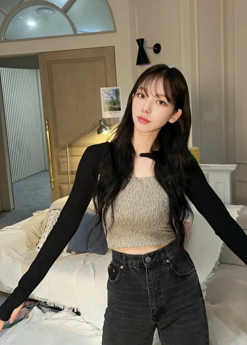 하의는 딥한 컬러의 흑청 데님이나 블랙 진을 매치해서 전체적으로 톤을 맞춘 모습입니다. 상의가 몸에 핏되는 스타일이라 하의는 너무 타이트하지 않은 핏을 선택해 밸런스를 맞춘 센스가 돋보여요. 양팔을 벌리고 살짝 미소 짓는 모습에서는 카리나 님 특유의 장난기 넘치면서도 러블리한 매력이 뿜어져 나옵니다. 뒤에 보이는 은은한 조명과 아늑한 인테리어가 어우러져서 더욱 따뜻하고 포근한 분위기를 만들어주고 있어요.
