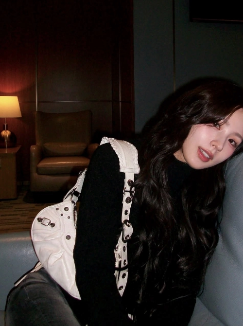또 다른 사진에서는 약간 힙한 무드도 엿볼 수 있었는데요. 어두운 조명 아래서 소파에 기대 찍은 사진 말이에요. 하얀색 발렌시아가 가방을 매치해서 블랙 룩에 확실한 포인트를 줬더라고요. 저 가방 요즘 패션 좀 안다 하는 분들은 다들 탐내는 아이템이잖아요. 시크하면서도 트렌디한 느낌을 잘 살린 것 같아요. 표정도 평소의 발랄한 모습과는 다르게 약간 나른하고 몽환적인 표정을 짓고 있어서 색다른 매력이 느껴졌어요.