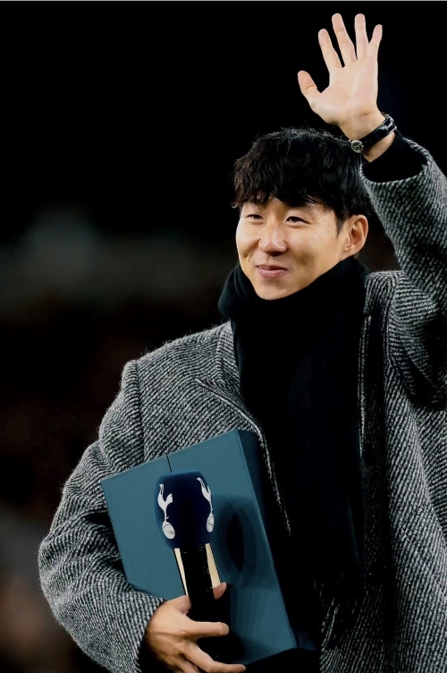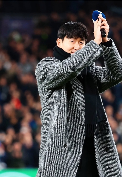 먼저 첫 번째 사진부터 함께 보실까요? 경기장에서 팬들에게 인사를 건네는 쏘니의 모습입니다. 회색 코트에 검은색 머플러를 매치한 모습이 마치 영화 속 한 장면 같지 않나요? 유니폼을 입고 그라운드를 누빌 때는 누구보다 치열한 전사 같지만, 이렇게 사복을 입고 팬들 앞에 섰을 때는 영락없는 '스윗 가이' 그 자체입니다. 손을 흔들며 환하게 웃는 저 표정에서 팬들을 향한 진심 어린 사랑이 뚝뚝 묻어나는 것 같아요. 마이크를 들고 있는 걸 보니 아마 팬들에게 감사의 인사를 전하는 시간이었던 것 같은데, 저 자리에 있었던 직관러들이 세상에서 제일 부러워지는 순간입니다.