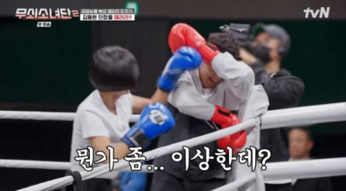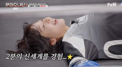 본격적인 훈련에 앞서 멤버들의 복싱 실력과 체력을 테스트하는 시간도 가졌습니다. 바로 이종격투기 선수 출신인 **김동현 단장**을 상대로 2분 동안 복싱 맛보기 체험을 한 건데요. 김동현 단장이 공격하지 않고 피하기만 했음에도 불구하고, '체력 광인'으로 소문난 유이 씨를 제외한 다른 멤버들은 모두 체력의 한계에 부딪혔다고 합니다.