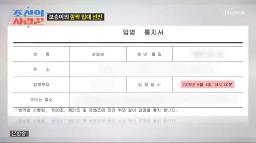 오는 7월 28일 방송되는 TV조선 '조선의 사랑꾼'에서는 많은 이들의 관심 속에 배우 손보승 군의 입대 현장이 공개됩니다. 앞서 공개된 예고편만으로도 시청자들의 마음을 뭉클하게 만들었는데요. 예고편 속에서 손보승 군은 군 입대를 앞두고 "집 떠나와..."라고 군가를 부르며 씩씩하게 머리를 깎는 모습을 보였습니다. 짧아지는 머리만큼이나 마음을 다잡으려는 듯한 그의 모습은 많은 아들 가진 부모님들의 공감을 자아냈을 겁니다. 입대 당일, 훈련소로 들어가기 전 훈련병들과 한곳에 모여 절도 있게 경례 연습을 하는 손보승 군의 모습은 이제 어엿한 군인이 다 되었음을 느끼게 했죠. 그의 옆에는 엄마 이경실 씨와 누나 손수아 씨가 함께하며 마지막까지 든든한 응원을 보냈다고 합니다. 이 가족의 마지막 모습이 어땠을지 벌써부터 기대되면서도 마음 한편이 짠해지네요.