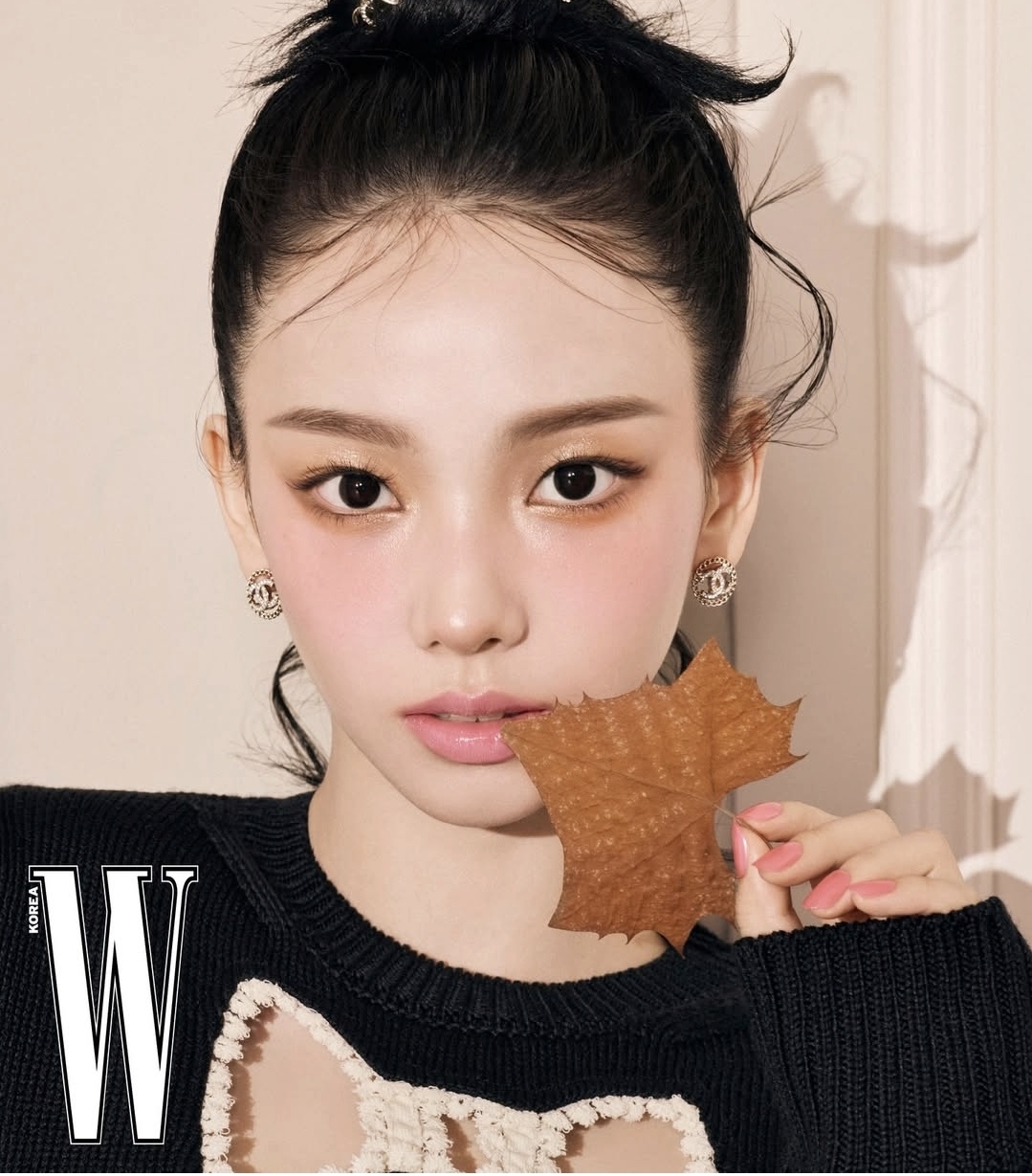 블랙 컬러의 니트를 입은 컷에서는 또 다른 매력이 느껴져요. 화이트 룩이 순수하고 맑은 천사 같았다면, 블랙 룩은 조금 더 시크하고 도시적인 분위기가 풍기죠? 하지만 여기서도 메이크업은 여전히 맑고 투명하게 연출해서, 카리나 님 특유의 고급스러운 이미지는 그대로 가져갔어요. 손에 든 단풍잎 하나조차도 패션 소품처럼 소화해버리는 그녀의 능력은 정말 어디까지일까요?