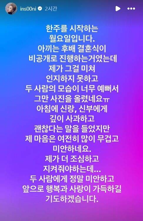 누리꾼들은 “비공개 결혼식 아니었나요?”, “신부 얼굴은 모자이크 처리해야 하는 거 아닌가요?” 등의 반응을 보였고, 심지어 “허락은 받으셨나요?”라는 직접적인 지적도 이어졌습니다. 이후 인순이 선배는 문제의 신부 사진만 조용히 삭제했고, 다른 사진과 글은 그대로 남겨 두었어요. 자신의 SNS를 통해 일상을 공유하고 싶었겠지만, 한 장의 사진이 그칠 수 없는 논란을 불러온 셈이죠.