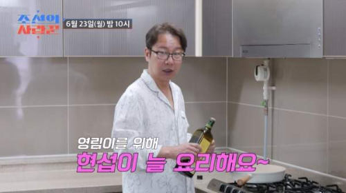 심현섭 씨는 이날도 평소처럼 아내를 위해 아침을 준비하고 있었어요. “늘 내가 세 끼를 다 해요. 별 거 없어요”라고 겸손하게 말했지만, 준비하는 메뉴는 오믈렛과 신선한 샐러드! 정성 가득한 그 모습에 VCR을 지켜보던 MC들도 연신 감탄했답니다.