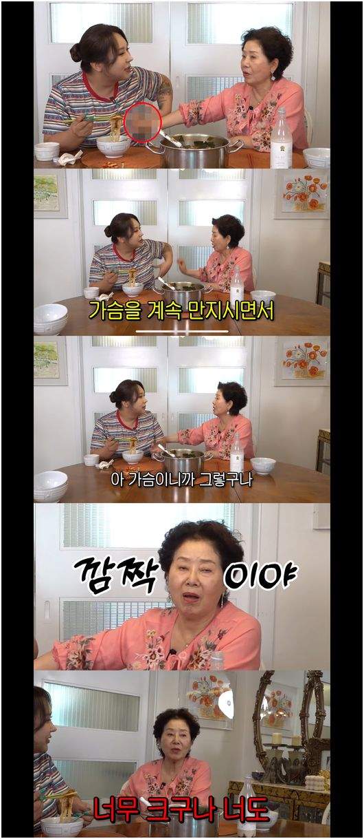 그런데 이때, 예상치 못한 상황이 벌어졌습니다! 풍자 님의 이야기를 듣던 선우용여 님이 갑자기 풍자 님의 팔뚝을 만지다가… 실수로 풍자 님의 가슴을 만지게 된 거예요! 😮 와우, 이 상황 정말 상상만 해도 너무 웃기지 않나요?