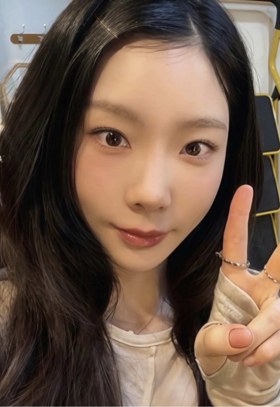 그리고 마지막에 브이 하고 찍은 초근접 셀카는 진짜 인간 복숭아 아닌가요? 앞선 전신사진들이 시크하고 힙한 느낌이었다면, 셀카는 영락없는 장난꾸러기 '탱구' 그 자체네요. 가까이서 찍었는데도 모공 하나 안 보이는 꿀피부에, 맑고 투명한 갈색 눈동자가 정말 예뻐요. 반지를 여러 개 레이어드해서 낀 손가락 디테일까지 귀엽고 힙해서 따라 하고 싶어지게 만들어요.